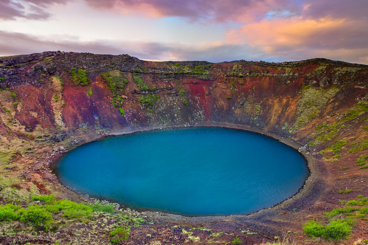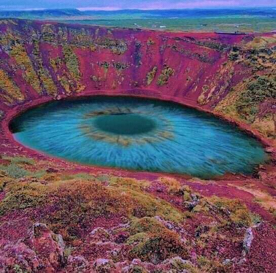 Göz şeklindeki krater gölüne ait olduğu iddiasıyla paylaşılan fotoğraf, İzlanda’daki Kerid Krater Gölü’ne ait görsel üzerinde oynanarak oluşturulmuş.