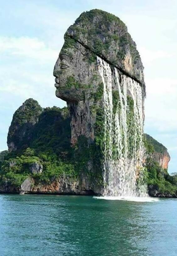 İnsan suretindeki kaya üzerinden şelale görseli montaj ürünü. Tayland’taki Phang Nga körfezinde yer alan bir adaya ait görsel üzerinde fotoşopla oluşturulmuş.