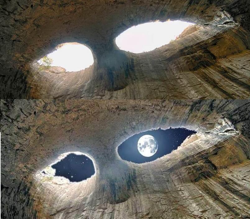 Bulgaristan’ın kuzeyindeki Lovech bölgesindeki Karlukovo köyünde yer alan Prohodna Mağarası‘nın tavanında yer alan 2 gözü andıran dev oyuktan Ay’ın gözüktüğü anı yansıttığı iddia edilen fotoğraf da fotoşop ürünü.