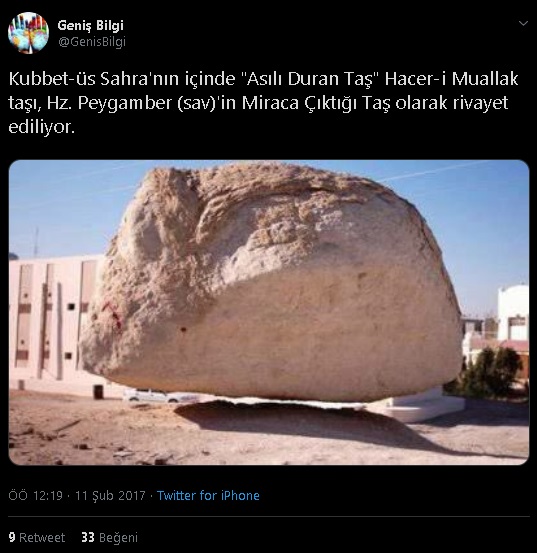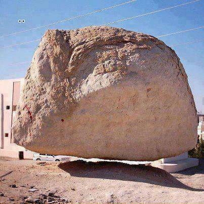 Fotoğraftaki kayanın havada asılı durduğu ya da İslâm inancına göre Hz. Muhammed’in Miraca üzerinden yükseldiği Kubbet-üs Sahra’daki Hacer-i Muallak (Muallak Taşı) olduğu iddiasının doğruluk payı bulunmamaktadır. Bahse konu kaya, Suudi Arabistan’ın Al Twaitheer köyünde yer almaktadır ve yere temas eden 3 ayak üzerinde durmaktadır. Havada asılı durduğunu gösteren görseller montaj ürünüdür. Muallak Taşı olarak bilinen yapı Kudüs’te Kubbet-üs Sahra’nın altındadır.
