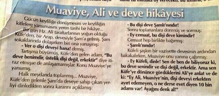 Gerek iktidara yakın medya gerekse muhalif medyada köşe koruyucu yazarlar, geçmiş süreçteki çeşitli hadiseler karşısında Muaviye’nin “dişi deve” hikayesi üzerinden okuyucularına mesaj vermeye çalışmakta.