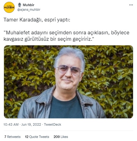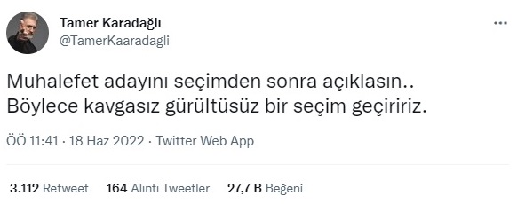 “TamerKaaradagli” uzantılı Twitter profilinin “Muhalefet adayını seçimden sonra açıklasın.. Böylece kavgasız gürültüsüz bir seçim geçiririz.” paylaşımı Tamer Karadağlı’ya ait sanılarak sosyal medyada ve haber sitelerinde aktarıldı.