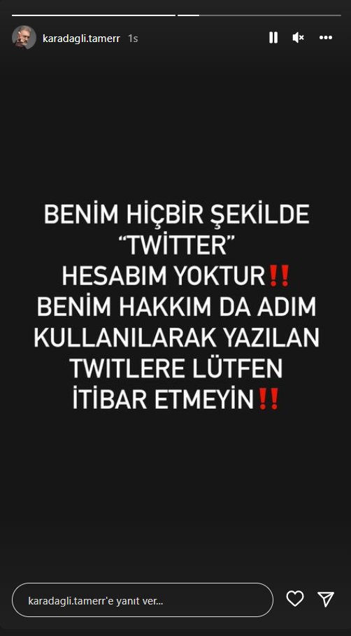 Sahte hesaptan yapılan paylaşımın ardından Tamer Karadağlı, Instagram hesabında attığı hikâyede Twitter kullanmadığını “Benim hiçbir şekilde ‘Twitter’ hesabım yoktur! Benim hakkım da adım kullanılarak yazılan twitlere lütfen itibar etmeyin!” ifadeleriyle belirtmişti.