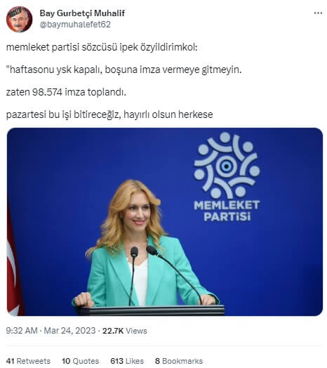 Bay Gurbetçi Muhalif (@baymuhalefet62): “memleket partisi sözcüsü ipek özyildirimkol: “haftasonu ysk kapalı, boşuna imza vermeye gitmeyin. zaten 98.574 imza toplandı. pazartesi bu işi bitireceğiz, hayırlı olsun herkese”