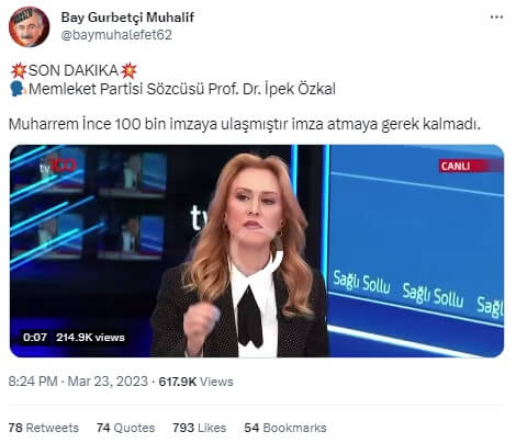 Özkal’ın TV100’de 23 Mart 2023 günü yayınlanan Erdoğan Aktaş ile Sağlı Sollu adlı programda kullandığı “Sayın Muharrem İnce’nin 100.000 adaylık imza süreci bitmiştir dolmuştur 100.000 imzayı toplamıştır bundan sonra gelecek olan başvurularda ceza alınmaktadır” ifadeleri kesilerek sosyal medyada paylaşılmış.