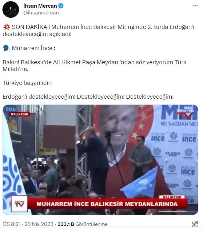 Memleket Partisi Genel Başkanı ve Cumhurbaşkanı Adayı Muharrem İnce’nin 29 Nisan 2023 günü Balıkesir’de düzenlenen mitinginde kullandığı ifadeler makaslanarak İnce’nin Cumhurbaşkanlığı seçiminin 2. tura kalması durumunda Cumhurbaşkanı Adayı Recep Tayyip Erdoğan’ı destekleyeceğini söylediği iddiasıyla sosyal medyada servis edilmiş.