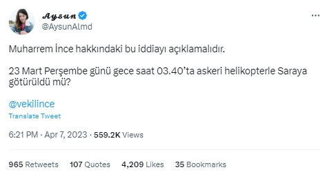 “Muharrem İnce, Yüksek Seçim Kurulu’nda (YSK) rehin tutulmaktadır. ‘Dediğimizi yapmazsan yarın kan gövdeyi götürür’ denmiştir. Koruma polisi bunu merkeze iletmiştir. İnce’nin eşi de ortada yok. WhatsApp’dan zorla İsmail Küçükkaya’ya’a ‘Adam kazandı’ mesajı attırılmış. Üstüne 7 YSK üyesine zorla dediklerini yaptırıyorlar. Meral Akşener ise tamamıyla kayıp ve hakkında kesin bir bilgi yok. FOX TV basıldı, A Haber gibi yapıldı. Yayınlar kesildi. İşte bu bir darbedir. İzmir, İstanbul’da mobese kameraları kapatılmıştır. Haberler susturulmuştur.”