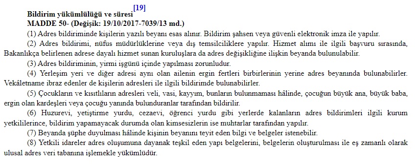 MADDE 50- (2) Yerleşim yeri adreslerinin tutulmasında kişilerin yazılı beyanı esas alınır. Bildirim, nüfus müdürlüklerine ve dış temsilciliklerimize adres beyan formuyla yapılır. Yerleşim yeri adresi aynı konut olan ailenin ergin fertleri birbirlerinin yerine adres beyanında bulunabilirler.