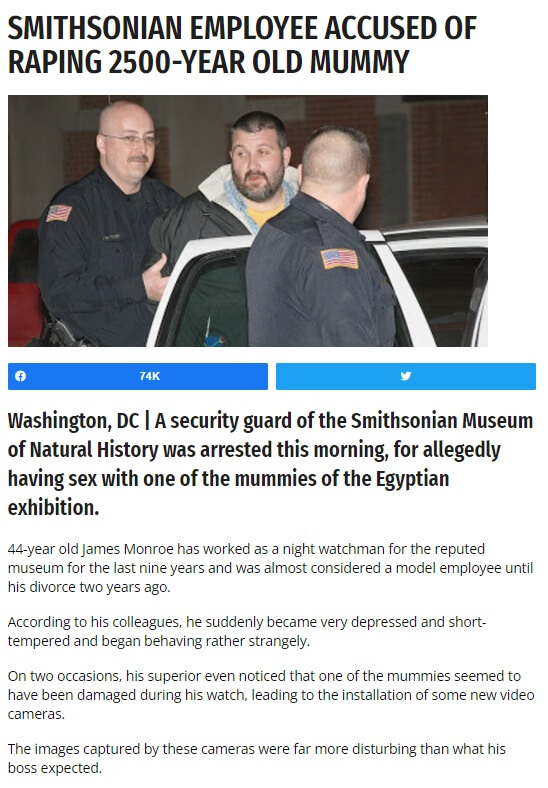 ABD’nin başkenti Washington D.C. eyaletindeki Smithsonian müzesinde gece bekçiliği yapan James Monroe adlı şahsın 2500 yıllık bir mumyaya tecavüz ettiğinin tespit edildiği sanılmıştı.