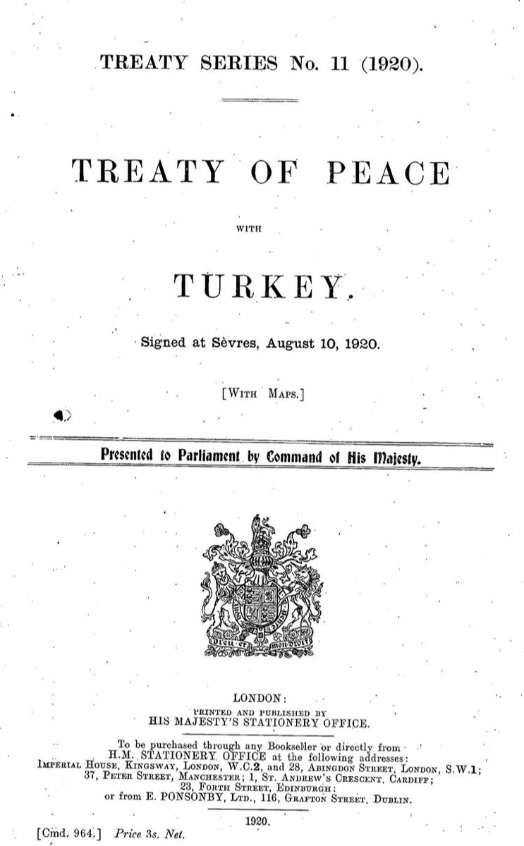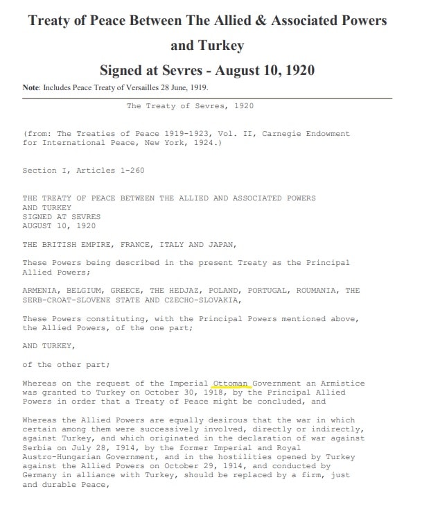 “Whereas on the request of the Imperial Ottoman Government an Armistice was granted to Turkey on October 30, 1918, by the Principal Allied Powers in order that a Treaty of Peace might be concluded”