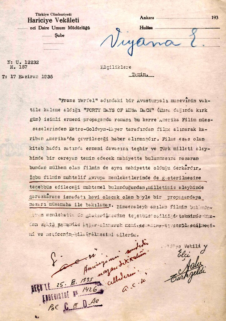 ‘Franz Werfel’ adındaki bir Avusturyalı musevinin vaktile kaleme aldığı ‘FORTY DAYS OF MUSA DAGH’ (Musa dağında kırk gün) isimli ermeni propaganda romanı bu kerre Amerika Filim müesseselerinden Metro-Goldwyn-Mayer tarafından filme alınarak kariben Amerika’da çevrileceği haber alınmıştır. Filme esas olan kitab haddı zatında ermeni davasını teşhir ve Türk milleti aleyhinde bir cereyan temin edecek mahiyette bulunmasına nazaran bundan mülhem olan filmin de aynı mahiyette olduğu derkârdır. İşbu filmin muhtelif Avrupa memleketlerinde de gösterilmesine teşebbüs edileceği muhtemel bulunduğundan, milletiğimiz aleyhinde garazkârane isnadatı havi olacak böyle bir propagandaya nazarı müsabaha ile bakılamaz. Binaenaleyh anılan filmin bulunduğunuz memlekette de gösterildiğine teşebbüs edildiği takdirde bundan vakti zamanda haber alınarak mani …. tevessül edilmesini ve neticenin bildirilmesini dilerim.”