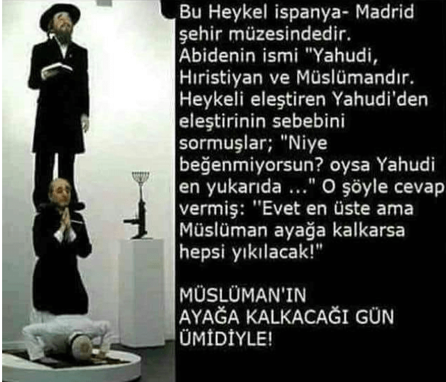Sosyal medya platformlarında “Müslüman ayağa kalkarsa” ya da “Müslüman ayağa kalktığında hepsi yıkılacak aslında” gibi ifadelerle kurgu bir anlatıyla aşağıdaki heykel görselinin paylaşıldığına şahit oluyoruz.