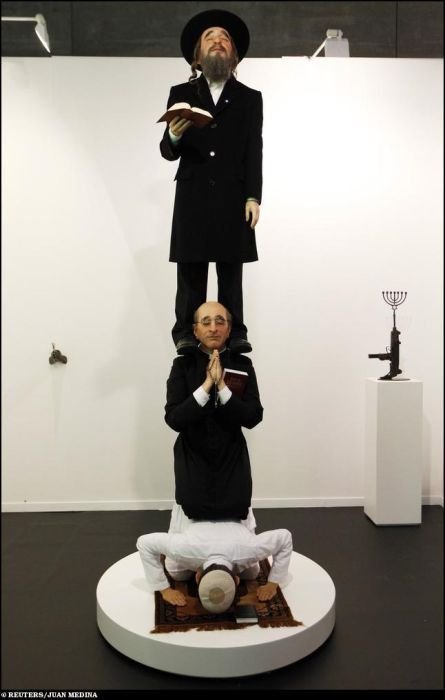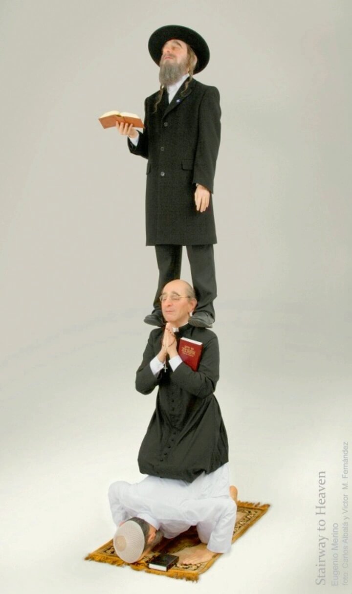 Üst üste ibadet eden Müslüman, Hristiyan ve Yahudi’den oluşan heykel İspanyol sanatçı Eugenio Merino’nun 2010 yılında sergilenen “Cennete Giden Merdiven” (“Stairway to Heaven”) adını verdiği çalışması