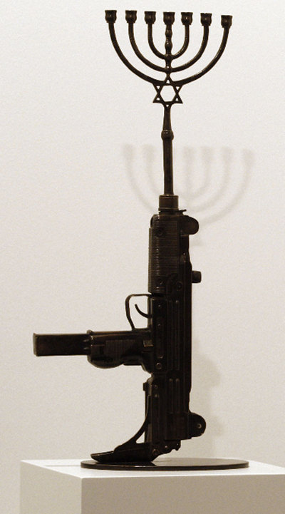Heykelin yanındaki çalışmada ise makineli bir silahın namlusunun ucuna geçirilmiş Museviliğin sembollerinden biri olan yedi kollu şamdan (menora) yer alıyor.