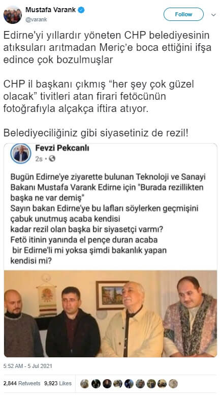 Mustafa Varank, CHP Edirne İl Başkanı Fevzi Pekcanlı’nın bahse konu fotoğrafı içeren paylaşımı hakkında “alçakça iftira” tanımını kullanmıştı. Varank’ın ilgili paylaşımı şu şekildeydi: