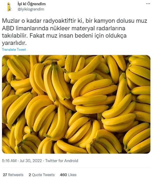 “Muzlar o kadar radyoaktiftir ki, bir kamyon dolusu muz ABD limanlarında nükleer materyal radarlarına takılabilir. Fakat muz insan bedeni için oldukça yararlıdır.”