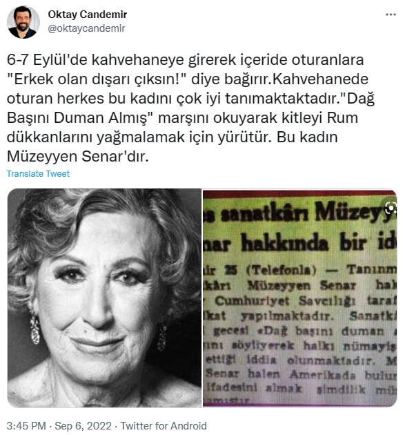 “2015 yılında kaybettiğimiz Cumhuriyetimizin divası Müzeyyen Senar hakkında 13.09.2022 tarihinde attığı tweet ile Müzeyyen Senar’ı, 6-7 eylül vakasının müsebbiplerinden biriymiş gibi gösteren gazeteci Oktay Candemir hakkında Müzeyyen Senar Miraskarları, savcılığa suç duyurusunda bulunmuştur. Oktay Candemir, her ne kadar atmış olduğu bu tweet’in, gazetecilik ve eleştiri hürriyeti kapsamında kaldığını iddia etse de, kişilere suç isnat etmenin eleştiri hürriyeti olamayacağı kesindir. Öyle olduğunu varsaysak dahi, yapılan eleştirinin, gazetecilik mesleğinde ve etiğinde bir dayanaktan beslenmiş olması gerekmektedir.”