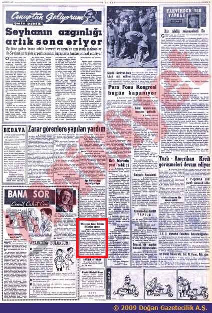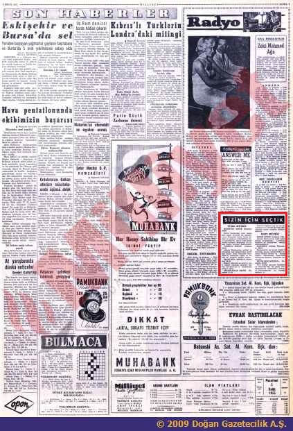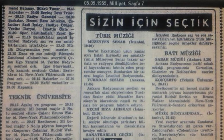 5 Eylül 1955 tarihli Milliyet gazetesinin 7. sayfasındaki “Radyo” başlıklı köşenin “Sizin İçin Seçtiklerimiz” başlıklı bölümünde şu ifadelere yer verildiği görülüyor: