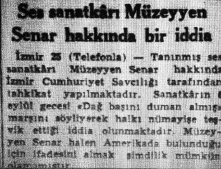 “Ses sanatkârı Müzeyyen Senar hakkında İzmir savcılığı tarafından tahkikat yapılmaktadr. Sanatkârın 6 Eylül gecesi Dağ Başını Duman Almış marşını söyleyerek halkı nümâyişe teşvik ettiği iddia olunmaktadır. Senar hâlen Amerikada olduğu için ifâdesini almak şimdilik mümkün olamamıştır.”