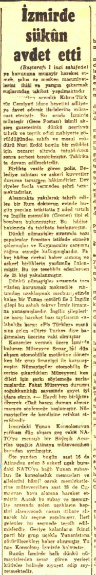 “Olayların bir de İzmir boyutu vardı. 6 Eylül gecesi saldırılar özellikle Fuar’da yoğunlaşmış, Yunanistan pavyonu harap edilmişti. Kültürpark’taki Mogambo kulübüne doluşan yağmacıları geri püskürtmek için, sahnedeki piyanist İlham Gencer mikrofonla İstiklal Marşı’nı okumaya ve hep bir ağızdan tüm salona okutmaya başlıyor, bu arada seyirciler arasındaki Müzeyyen Senar ‘Türküz, hepimiz Türküz’ diye bağırıyordu.”