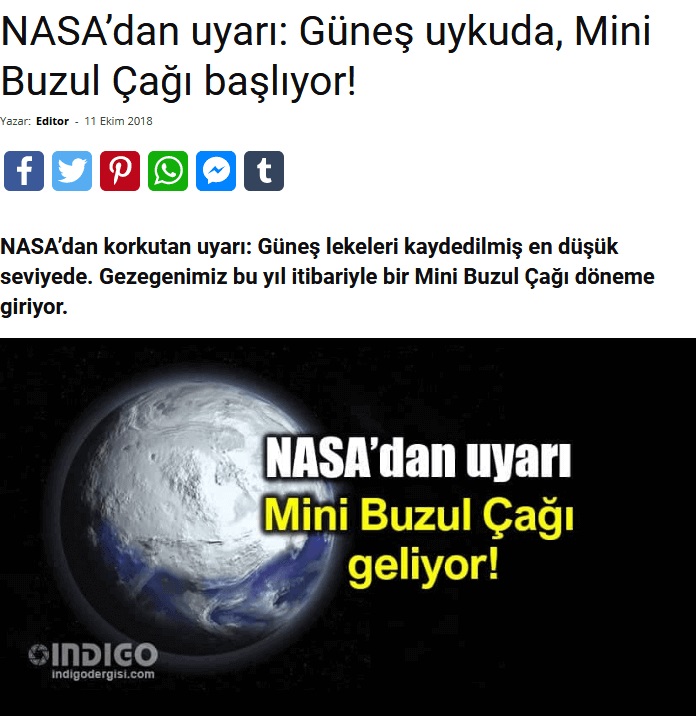 Makalenin başlıgı harika olmuş.. “NASA’nın Güneş’in Solar Minimuma Girmesi Nedeniyle Uyarı Yaptığı İddiası” bunun nesi iddaa değil.. yaptı mı sanki.. Güneş Solar Minimum’da. Şu yazıyı okuyup ne dediğini anlayamayan ahmağın daniskasıdır. Abilerim ablalarım buradan durumsal tespiti yapıldığını hatalı bilgi paylaşılmadığını düşünmek; angut olması lazım bir insanın..