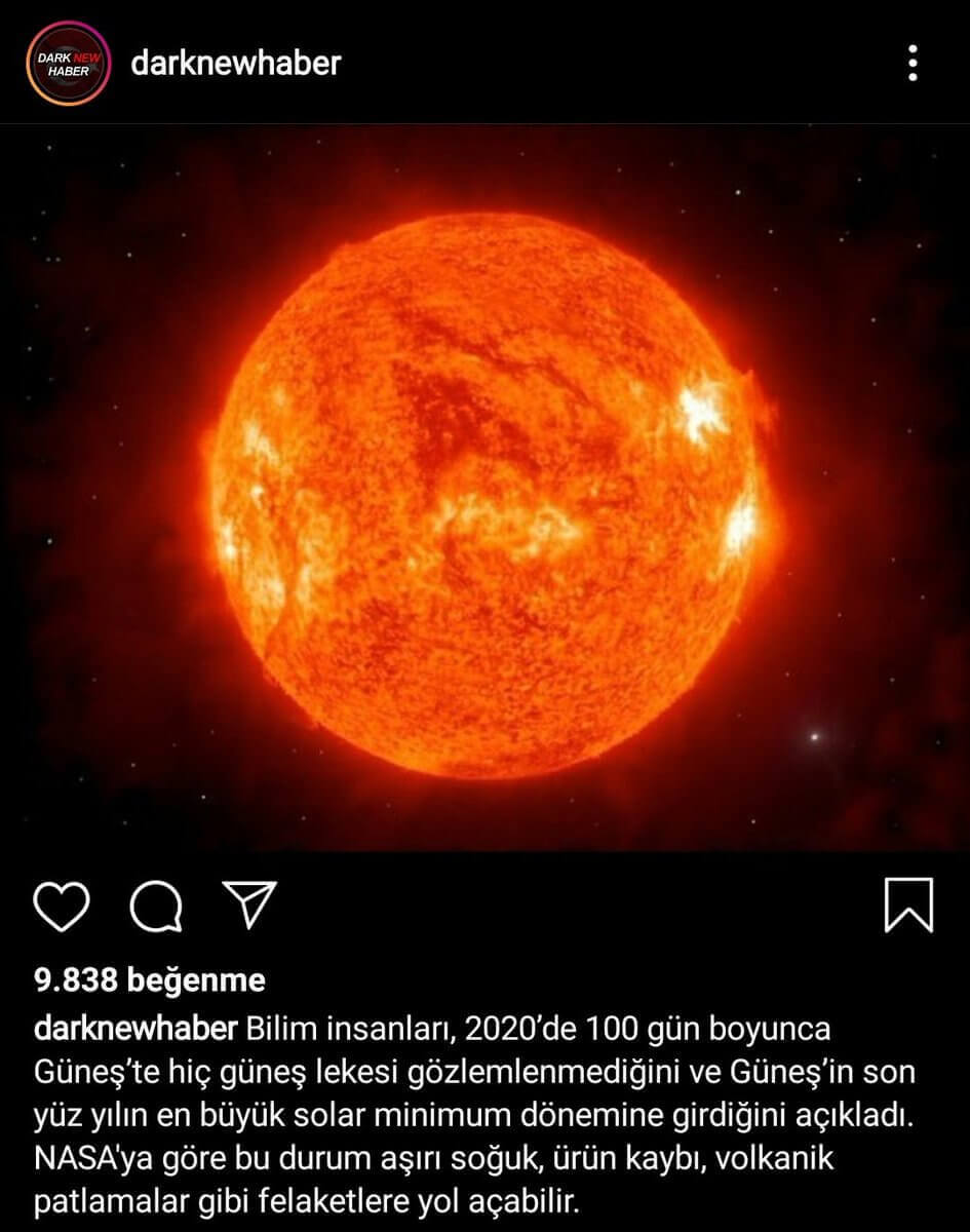 Çeşitli haber platformları ve sosyal medya kullanıcıları tarafından öne sürülen iddiaya göre bilim insanları 2020 yılında 100 gün boyunca Güneş’te hiç güneş lekesi gözlemlenmediğini ve Güneş’in son yüz yılın en büyük solar minimum dönemine girdiğini, NASA ise bu durumun Dünya’da aşırı soğuk, ürün kaybı, kıtlık ve güçlü volkanik patlamalar yaşanmasına neden olabileceğini aktarmıştı.