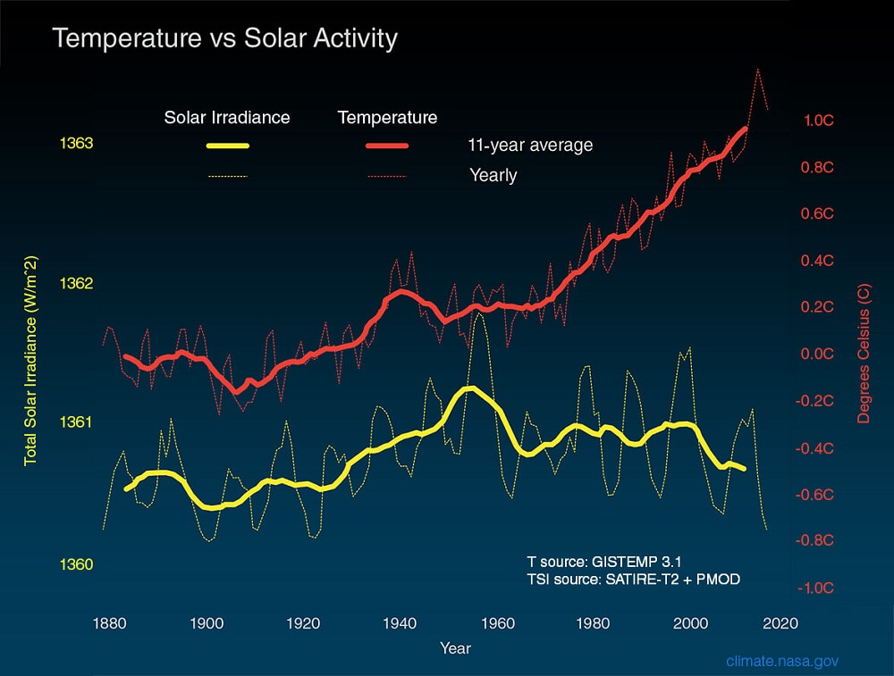 NASA’nın paylaştığı yukarıdaki grafik, 1880 yılından bu yana ölçümlenen küresel yüzey sıcaklığı değişikliklerini (kırmızı çizgi) ve Dünya’nın Güneş’ten aldığı enerjiyi (sarı çizgi) watt (enerji birimi) olarak karşılaştırmaktadır. Daha ince çizgiler yıllık seviyeleri gösterirken, daha kalın iken hatları 11 yıllık ortalama eğilimleri göstermektedir. Dünya’nın aldığı Güneş enerjisi miktarı, 1950’lerden bu yana net bir artış göstermeksizin 11 yıllık doğal iniş çıkışları izlese de küresel sıcaklık seviyesinin belirgin bir şekilde arttığı görülebilmektedir. Bu nedenle NASA, Güneş’in son yarım yüzyıl boyunca gözlemlenen küresel sıcaklık ısınma eğilimine neden olmasının son derece düşük bir ihtimal olduğuna inanmaktadır.