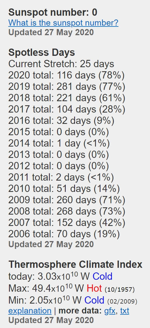 Güneş lekesiz gün sayısını kaydeden Spaceweather.com adlı internet sitesi, işbu yazı tarihi (27 Mayıs) itibarıyla 116 gündür Güneş’te bir leke gözlemlenemediğini aktarmaktadır.
