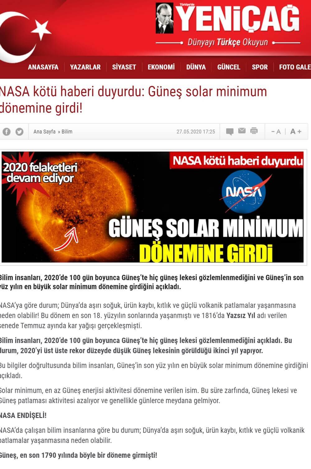Amerikan Ulusal Havacılık ve Uzay Dairesi’nin (National Aeronautics and Space Administration – NASA) Güneş’in solar minimum sürecine girmesi nedeniyle Dünya’da Dünya’da aşırı soğuk, ürün kaybı, kıtlık ve güçlü volkanik patlamalar yaşanabileceği yönünde uyarı duyurusu yapıldığı iddiası, hakikatle tam örtüşmeyen 2020 felaket senaryolarından biri.