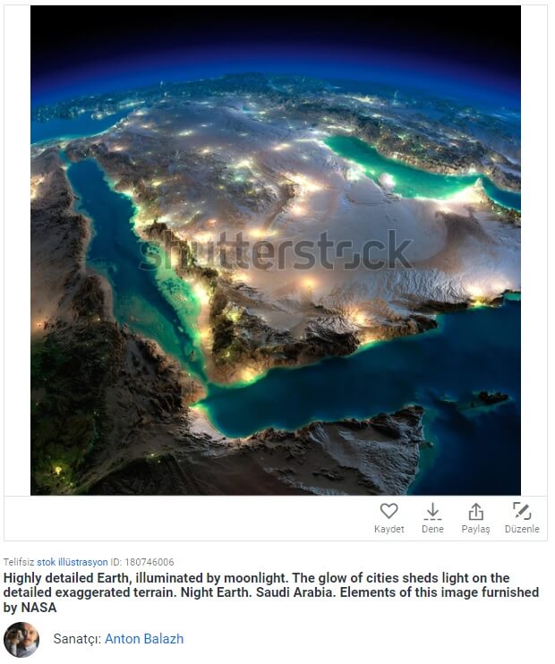 “Ay ışığıyla aydınlatılan son derece detaylı Dünya. Şehirlerin parıltısı, ayrıntılı abartılı araziye ışık tutuyor. Gece Dünya. Suudi Arabistan. NASA tarafından döşenmiş bu görüntünün unsurları”