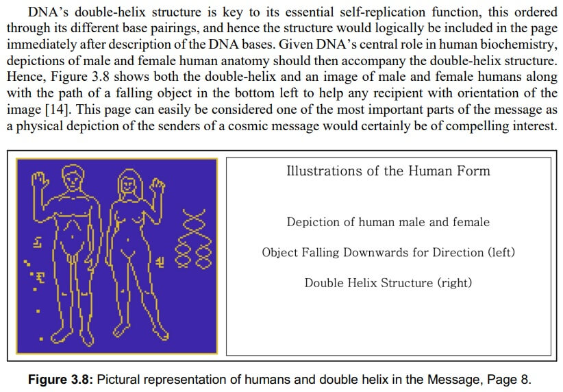 “DNA’nın çift sarmal yapısı, temel kendini kopyalama işlevinin anahtarıdır, bu, farklı baz eşleşmeleri aracılığıyla sıralanır ve bu nedenle yapı, mantıksal olarak DNA bazlarının açıklamasından hemen sonra sayfaya dahil edilir. DNA’nın insan biyokimyasındaki merkezi rolü göz önüne alındığında, erkek ve dişi insan anatomisinin tasvirleri çift sarmal yapıya eşlik etmelidir. Bu nedenle, Şekil 3.8, herhangi bir alıcıya görüntünün oryantasyonu ile yardımcı olmak için sol altta düşen bir nesnenin yolu ile birlikte hem çift sarmalı hem de erkek ve dişi insanların bir görüntüsünü göstermektedir [14]. Bu sayfa, mesajın en önemli bölümlerinden biri olarak kabul edilebilir, çünkü kozmik bir mesajı gönderenlerin fiziksel bir tasviri kesinlikle ilgi çekici olacaktır.”