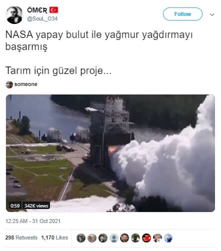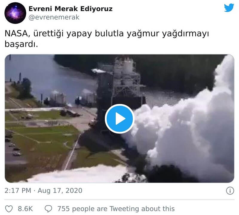 Sanılanın aksine video NASA’nın yapay bulut üreterek yağmur yağdırdığını anı yansıtmıyor. Video, NASA’nın yapay bulut üretimine değil uzay fırlatma sistemi için gerçekleştirilen roket motor testine ait. Atmosfere salınan partiküller vasıtasıyla “tohumlama” olarak bilinen yöntemle sunî şekilde yağmur oluşturma yönünde deneyler gerçekleştiriliyor (NASA, 2017 yılında kısa menzilli roketle suni bulut oluşturmayı amaçlayan bir deney gerçekleştirmişti). Ancak, paylaşılan görüntüdeki cihazın amacı bu değil.