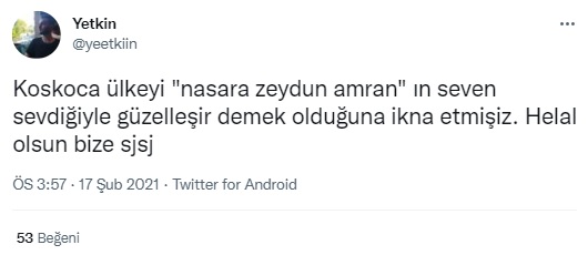 “E nasıl geçiyor 14 Şubat? Arapça’da bir söz vardır. ‘Nasara zeytün amran’ yani ‘seven sevdiğiyle güzelleşir’. Amenna. Sevgiliye. En sevgiliye…”