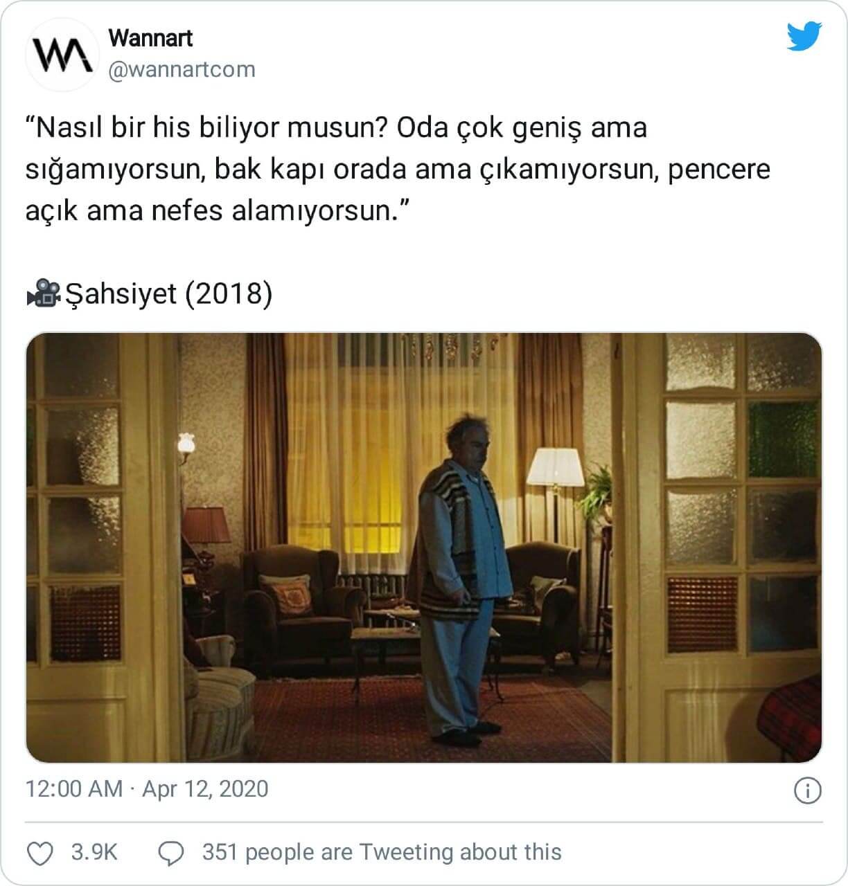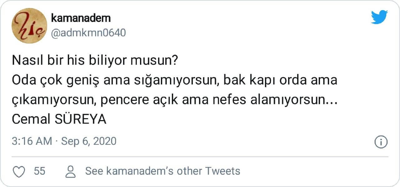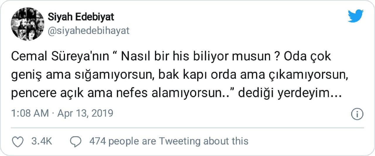 "“Nasıl bir his biliyor musun? Oda çok geniş ama sığamıyorsun/ Bak kapı orada ama çıkamıyorsun/ Pencere açık ama nefes alamıyorsun…” Cemal Süreya’nın, bu dizeleri bu günler için yazdığına yemin edebilirim ve başım ağrımaz!"
