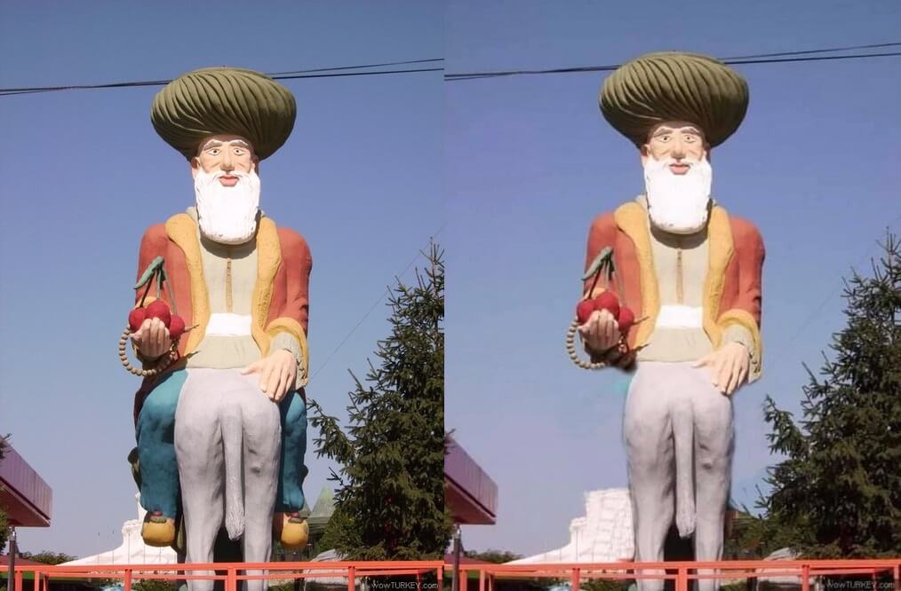 Elinde kirazla Nasrettin Hoca’nın eşeğe ters binmiş halini yansıtan heykel görseline ait olduğu iddiasıyla paylaşılan görselden Nasrettin Hoca’nın ayakları silinmiş ve normalden daha absürt görünüm oluşturulmuş.