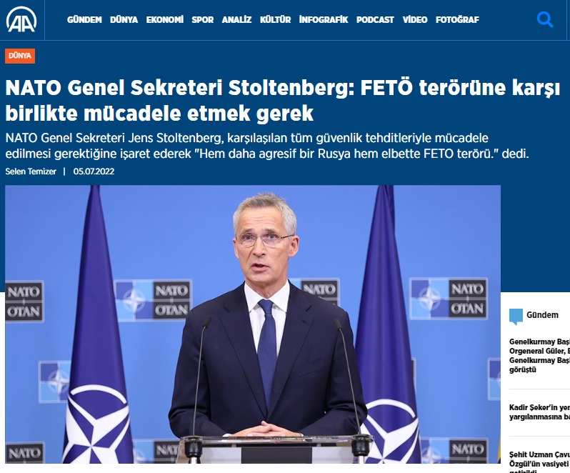 NATO Genel Sekreteri Jens Stoltenberg’in İsveç Dışişleri Bakanı Anne Linde ve Finlandiya Dışişleri Bakanı Pekka Haavisto ile iki ülkenin İttifak’a katılım protokollerinin imzalanması töreninin ardından 5 Temmuz 2022 günü düzenlenen ortak basın toplantısında Fethullahçı Terör Örgütü’nün kısaltması FETÖ ifadesini kullandığı ileri sürülmüştü.