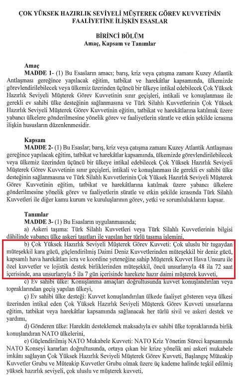Barış, kriz veya çatışma zamanı NATO Antlaşması gereğince yapılacak eğitim, tatbikat ve harekâtlar kapsamında ülkemizde görevlendirilebilecek veya ülkemiz üzerinden 3. bir ülkeye intikal edebilecek görev kuvvetinin operasyonları ile ilgili faaliyet esasları, bir NATO üyesi ülkeye müdahale odaklı değil.