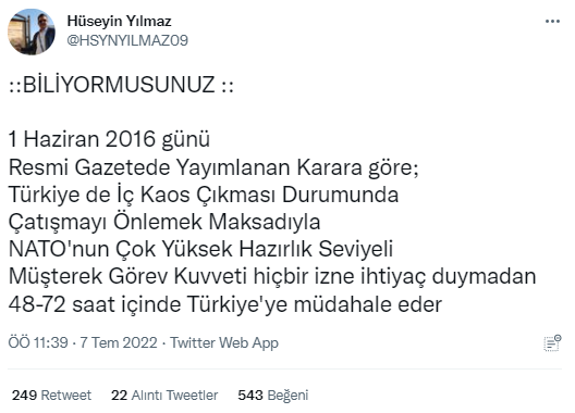 1 Haziran 2016 tarihli Resmî gazete yayımlanan, 2016/8858 sayılı 30 Mayıs 2016 tarihli Bakanlar Kurulu Kararı ile yürürlüğe konulması kararlaştırılan “Çok Yüksek Hazırlık Seviyeli Müşterek Görev Kuvvetinin Faaliyetine İlişkin Esaslar” metni ile NATO’ya 48-72 saat içerisinde Türkiye’ye izinsiz müdahale imkânı tanındığı iddiası sosyal medyada dile getirilmişti.
