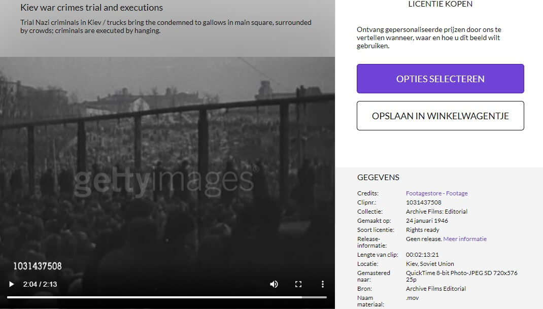 Getty Images arşivinde 24 Ocak 1946 tarihinde SSCB’ye Kiev’de gerçekleştirilen idamlara ilişkin video kayıttaki görüntülerle bahse konu fotoğraf eşleştirilebiliyor. Savaş suçlusu nazilerin Kiev’de kamyonlara yüklenerek kalabalık arasında idam cezalarının infaz edildiği notunu (“Trial Nazi criminals in Kiev / trucks bring the condemned to gallows in main square, surrounded by crowds; criminals are executed by hanging“) barındıran kayıttan ilgili bir an şöyle: