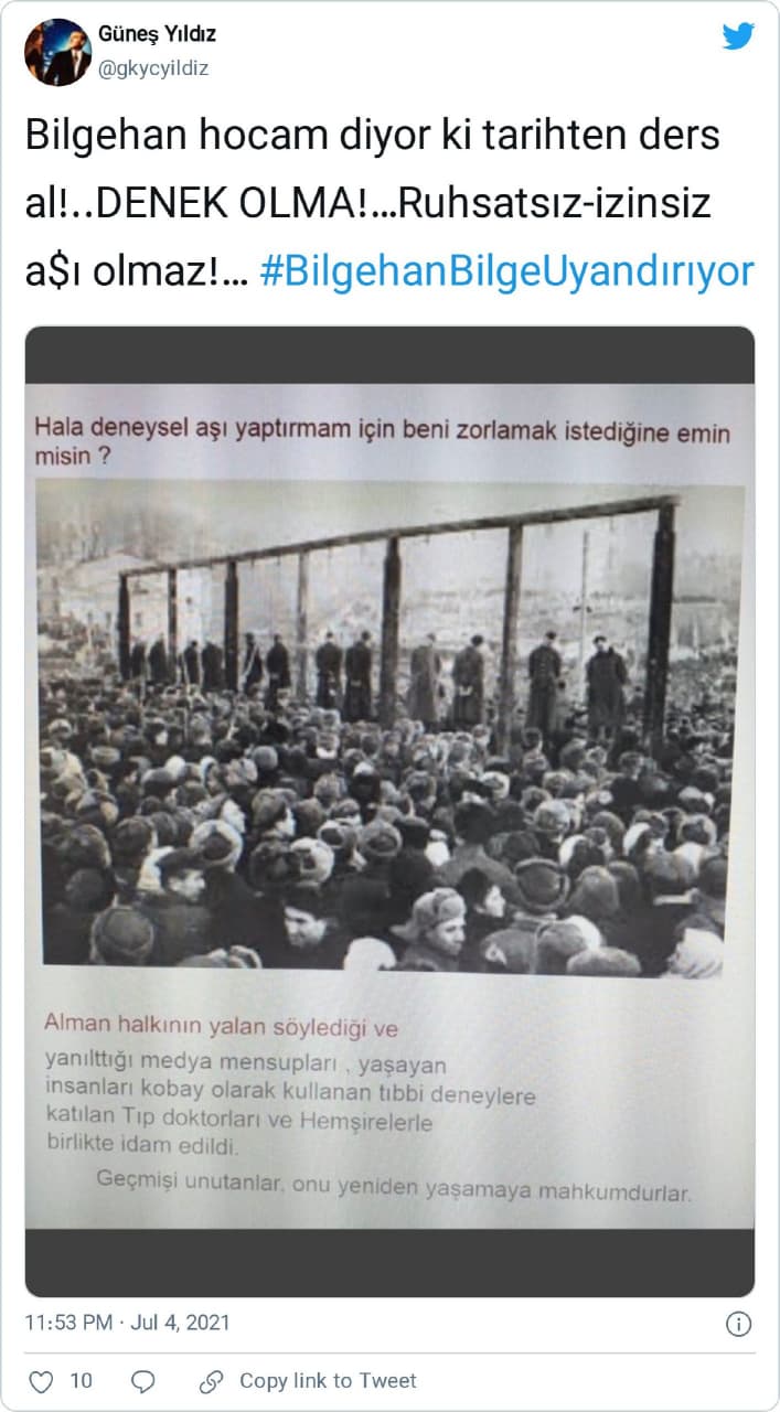 “Bilgehan hocam diyor ki tarihten ders al!.. DENEK OLMA!…Ruhsatsız-izinsiz a$ı olmaz!… #BilgehanBilgeUyandırıyor” notuyla bahse konu idam görüntüsünü aktaran bir örnek paylaşım: