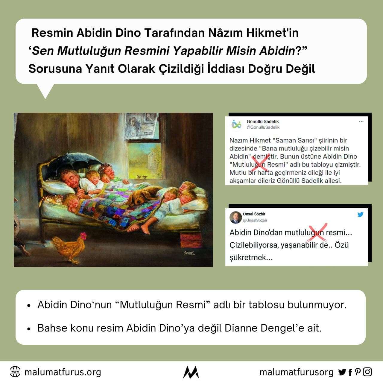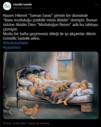 Bahse konu resmi yanlışlıkla Abidin Dino’ya ve Nâzım Hikmet’in “sen mutluluğun resmini çizebilir misin Abidin?” sorusuyla ilişkilendiren paylaşımlardan örnekler şöyle sunulabilir: