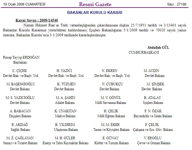 “Nazım Hikmet Ran’ın Türk vatandaşlığından çıkarılmasına ilişkin 25/7/1951 tarihli ve 3/13401 sayılı Bakanlar Kurulu Kararının yürürlükten kaldırılması; İçişleri Bakanlığının 5/1/2009 tarihli ve 70020 sayılı yazısı üzerine, Bakanlar Kurulu’nca 5/1/2009 tarihinde kararlaştırılmıştır.”