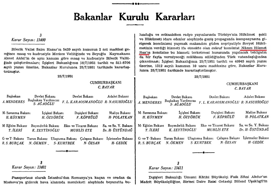 “Pasaportsuz olarak İstanbul’dan Romanya’ya kaçan ve oradan da Moskova’ya ‘giderek hava alanında memleketi aleyhinde beyanatta bu lunduğu ve ımütaakiben radyo yayınlarında Türkiye’nin Hükümet şekli ve Hükümeti idare edenler aleyhinde geniş propaganda kampanyasına giritişerek komünizmi yaymak maksadını güden neşriyatiyle Sovyet Hükümetinin verdiği hizmeti ifa etmekte olan m’âruf komünist Nâzım Hikmet Han’ın kendisine bu hizmeti terk etmesi hususunda yapılacak tebligatın da bir fayla vermiyeceği mülâhaza edildiğinden Türk vatandaşlığından çıkarılması; İçişleri Bakanlığının 25/7/1951 tarihli ve 40945 sayılı yazısı üzerine, 1312 sayılı kanunun 10 uncu maddesine göre, Bakanlar Kurulunca 25/7/1951 tarihinde kararlaştırılmıştır. 25/7/1951”