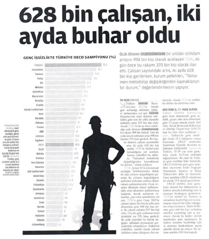 Bir örneğini, kapatılan Zaman Gazetesi’nde 17 Haziran 2015 tarihinde yayımlanan “628 bin çalışan, iki ayda buhar oldu (OECD yüzde 31, TÜİK yüzde 18 diyor)” başlıklı haberde görebiliyoruz: