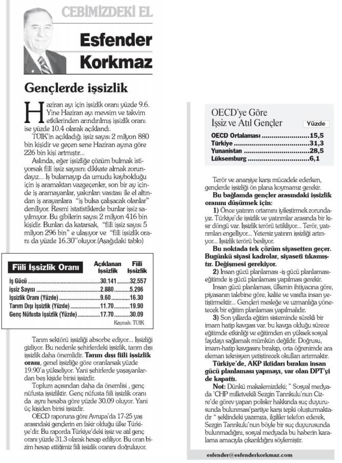 Esfender Korkmaz, 17 Eylül 2015 tarihli Yeniçağ Gazetesi’nde yayımlanan “Gençlerde işsizlik” başlıklı yazında OECD’nin NEET verisini genç işsizlik oranı olarak yorumlamıştı: