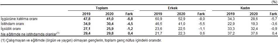 • 15-24 yaş grubunu kapsayan genç nüfusta işsizlik oranı %25,9, istihdam oranı %30,4, işgücüne katılma oranı %41,0 seviyesinde iken “ne eğitimde ne de istihdamda olanların oranı” ise %29,8 seviyesinde gerçekleşmişti.