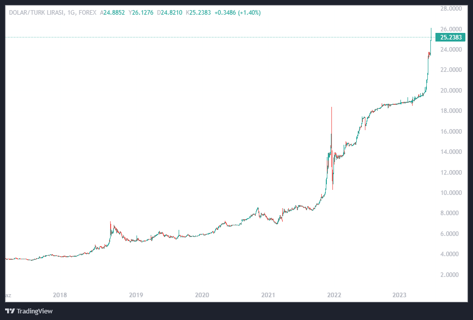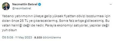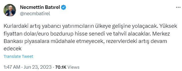 Batırel, 8 Haziran 2023 günü “Kurlar tepe noktasına ulaştı. Dolar 23.37 ile zirve yaptı. Bundan sonra yön aşağı.. önce 23 ardından 21.50’ye kadar geri çekilme başlar” tweetini attıktan sonra USD/TL kuru 25,4’e kadar yükseldi.