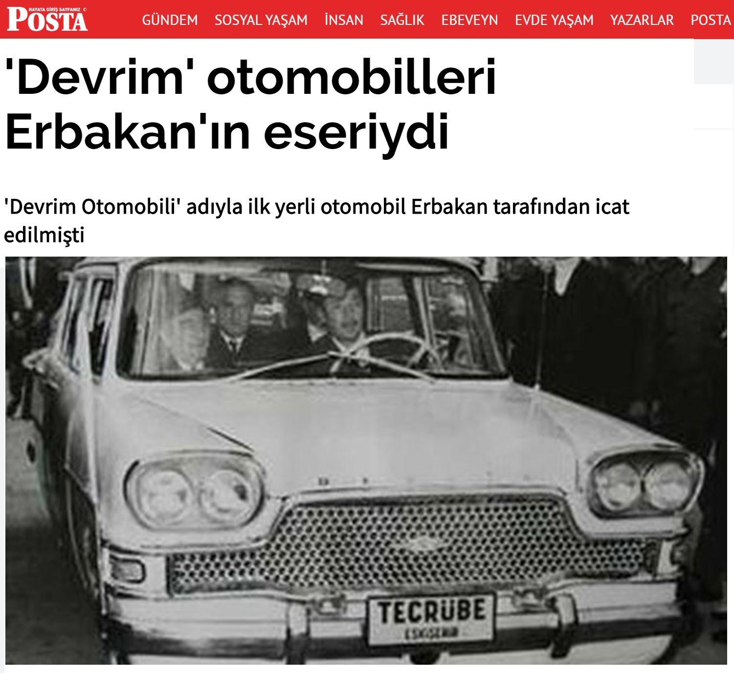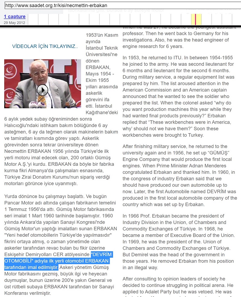 Necmettin Erbakan'ın yayınlanan özgeçmişi üzerinden Devrim otomobilini Erbakan'ın ürettiğini öne süren haber