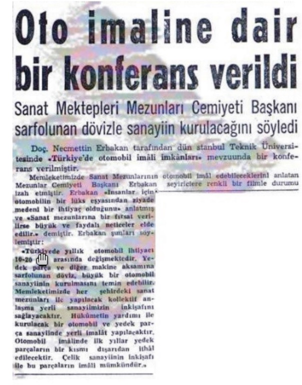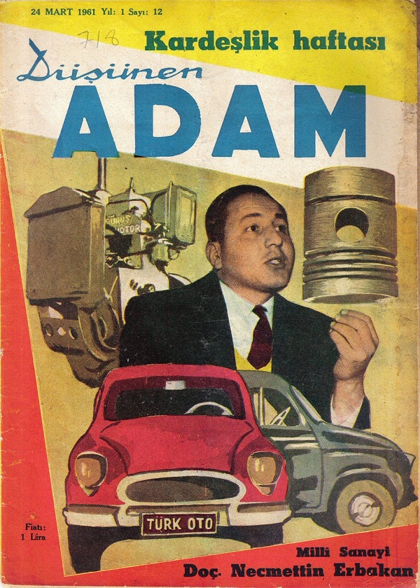 Düşünen Adam adlı derginin 24 Mart 1961 tarihli sayısının kapağında kendine yer bulan Necmettin Erbakan’ın yerli motor ve otomobil konusundaki görüşleri “Türk Otomobili” başlıklı yazıda şöyle aktarılmıştı (Ekrem Şama (2014). Allah Dostu Erbakan):