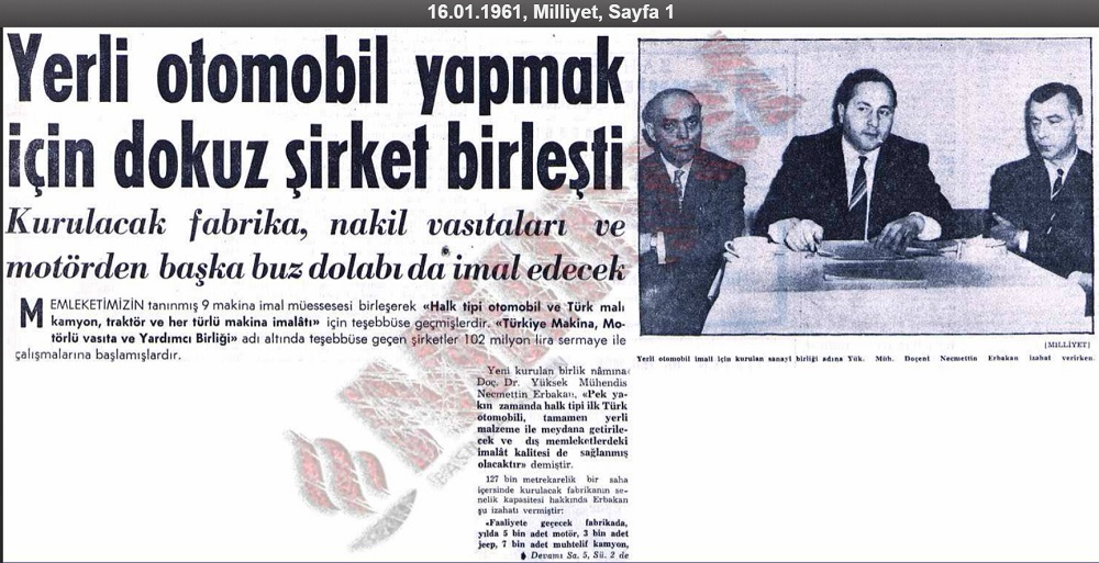 Milliyet Gazetesinin 16 Ocak 1961 tarihindeki "Yerli Otomobil Yapmak İçin Dokuz Şirket Birleşti" başlıklı haber küpürü